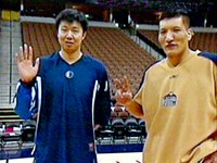 圖:王治郅和巴特爾在美國(guó)NBA賽場(chǎng)上對(duì)決