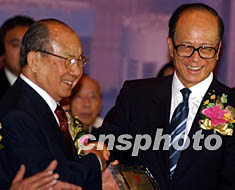 ![]() 擁有一百萬潮藉人口、一百多個(gè)潮藉社團(tuán)的香港,4月23日成立了“香港潮屬社團(tuán)總會(huì)”, 主席陳偉男向出任榮譽(yù)會(huì)長(zhǎng)的香港長(zhǎng)實(shí)集團(tuán)主席李嘉誠(chéng)頒發(fā)證書。中新社記者 任晨鳴 攝