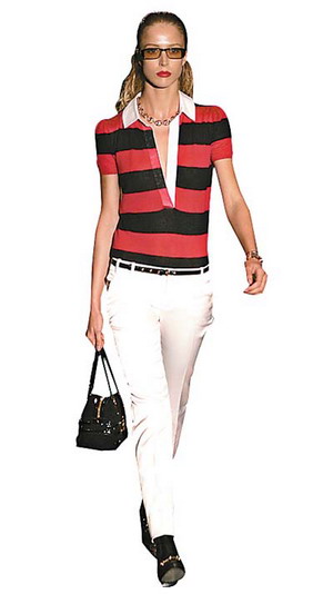 一直以來走性感路線的BottegaVeneta在2006年春夏推出了搶眼的紅白條紋短裝,具有線條感的豎條紋束胸式上衣包裹了女士們上半身的美好曲線,而下半身搭配一件紅白相間的條紋短褲,既富有動感又顯得性感迷人。Gucci也以紅黑搭配的條紋打造了現(xiàn)代都市女性的風采,深V領的紅黑條紋T恤搭配一件剪裁良好的白色長褲,行走于都市街頭,展現(xiàn)出一種獨特的英姿。