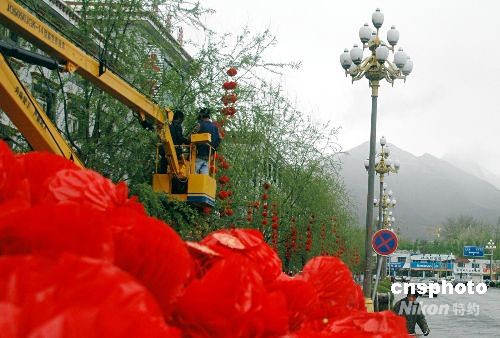 4月30日,拉薩市康昂東路,工人站在高高的吊車上懸掛燈籠,他們身后一串串火紅的小燈籠與柳樹翠綠的枝條隨風擺動,構(gòu)成一道美麗的風景線。為迎接北京奧運會和慶祝五一節(jié),拉薩市投入大量人力物力裝扮曾受“3.14”事件影響的城市容貌,目前,拉薩被毀壞的公共設(shè)施已全面修復(fù),所有街道被點綴得清潔亮麗,令市民和游客流連忘返。中新社發(fā) 周波 攝