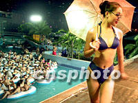 在仲夏夜里,廣州知名的水上樂園“黃金海岸”招徠顧客出奇招,讓泳客泡在水里欣賞靚女泳裝秀。中新社圖 邢健 攝