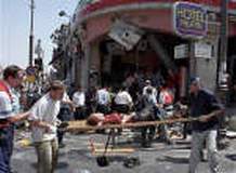 耶路撒冷爆炸:以內(nèi)政部長說十七人死亡(圖) 2001年08月09日 22:28 一名在爆炸事件中受傷的婦女正被抬上救護(hù)車。 | |||