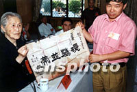 圖:辛亥革命后人給長樂市村民送當(dāng)年實(shí)物 2001年10月12日 18:15 ![]() 辛亥革命老人、孫中山先生秘書黃展云的女兒黃以雍,十一日以九十三歲的高齡專程赴長樂市,為其父于一九二七年創(chuàng)辦的“營前模范村”后人林泉送上父親當(dāng)年親筆提寫的匾額。中新社圖 陳勇 攝 |