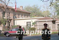 圖文:紐約空難后美國(guó)駐華大使館擴(kuò)大警戒范圍 2001年11月13日 15:37 ![]() 北京警方13日在美國(guó)駐中國(guó)大使館前增加警力并擴(kuò)大了警戒范圍,幾條通往使館門(mén)前的道路都設(shè)置了路障,禁止行人和車輛通行。美國(guó)美洲航空公司一架空中客車十二日在紐約墜毀,是否與恐怖主義襲擊有關(guān)仍有待進(jìn)一步調(diào)查。中新社圖 武仲林 攝 ![]() 美國(guó)墜機(jī)事件后,中國(guó)軍方十三日對(duì)位于北京建國(guó)門(mén)外的美國(guó)使館區(qū)加強(qiáng)安保工作。“九一一”后一直實(shí)行戒嚴(yán)的美使館區(qū)內(nèi)秩序安定。中新社圖 劉殊瑾 攝