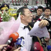 圖文:一討債公司老板向呂秀蓮求婚遭警方攔下 2001年12月11日 13:51 ![]() 呂秀蓮(資料圖片) ![]() 董念臺11日捧著99朵紅玫瑰,率領48輛豪華禮車,浩浩蕩蕩去向心儀許久的呂秀蓮求婚,但遭警方攔下。董念臺說不能阻止他求婚的意志。(張良一攝) 中新網香港12月11日消息:臺北訊,臺灣一討債公司負責人董念臺今天上午演出向呂秀蓮“求婚記”,不過求婚車隊在途中即遭到臺北市警察局攔下,董念臺在不滿下憤而離去。 據“中央社”報道,對于今天的求婚之舉,董念臺稱,他欣賞呂秀蓮憨直、有話直說的個性,他認為呂是位優(yōu)秀的女性。 上午九時許,由十二輛奔馳、十二輛卡迪拉克高級轎車組成的車隊從臺北市中正紀念堂出發(fā),浩浩蕩蕩準備到“總統(tǒng)府”“求婚”。 車隊在抵達“總統(tǒng)府”前的貴陽路遭轄區(qū)員警攔下,董念臺穿著燕尾服,手上拿著九十九朵玫瑰和一封求婚信件,他不滿指出,他與呂秀蓮男女未婚,答應求婚與否固然是女方的權利,但求婚也是他的自由,這是人民應有的民主法治。 董念臺說,如果說他妨礙交通,事前他已去函臺北市警局,但警方并未制止,現在又說他違反“集會游行法”,他認為是警方違法在先。 稍后,董念臺認為既然高攀不起,憤而將玫瑰花扔在地上后離去。 相關報道:真情?搞笑?臺灣一討債公司老板向呂秀蓮求婚 |