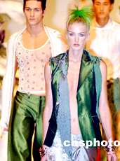 ![]() 香港時(shí)裝節(jié)展示前衛(wèi)男女冬裝!跋愀蹠r(shí)裝節(jié)2002秋冬系列”的“冬日傳奇”時(shí)裝展示1月15日在香港會(huì)展中心舉行,模特在“冰天雪地”中展示香港設(shè)計(jì)師最新設(shè)計(jì)的男女前衛(wèi)冬裝。中新社傳真 任晨鳴 攝 ![]() 香港時(shí)裝節(jié)展示黑紅相佩女冬裝!跋愀蹠r(shí)裝節(jié)2002秋冬系列”的“冬日傳奇”時(shí)裝展示1月15日在香港會(huì)展中心舉行,模特在“冰天雪地”中展示香港設(shè)計(jì)師最新設(shè)計(jì)的黑紅相佩的女冬裝。中新社傳真 任晨鳴 攝