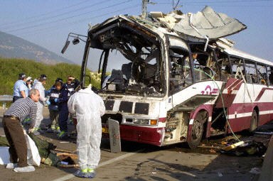 圖文:以色列海法公車遭自殺炸彈襲擊10人死亡 2002年04月10日 14:04 ![]() 圖為被炸彈襲擊的公車。法新社圖 中新網(wǎng)北京4月10日消息:法新社援引以色列醫(yī)院方面的消息說(shuō),今天在以色列北部城市海法的公車自殺炸彈襲擊事件中,至少有10人死亡,另有20人受傷。 當(dāng)?shù)剀姺诫娕_(tái)的報(bào)道也援引紅十字會(huì)性質(zhì)組織的消息說(shuō),至少有10人死亡。據(jù)目擊者說(shuō),這次爆炸將遇襲公車的車頂炸穿。 而路透社的報(bào)道則說(shuō),上述緊急救援組織的的官員說(shuō),有8人在爆炸中死亡。以色列的媒體早先報(bào)道的死亡數(shù)字為10人。 報(bào)道還援引警方和救援工作者的消息說(shuō),一名自殺炸彈襲擊者今天上午交通高峰期在一輛擁擠的公車上引爆炸彈,造成至少8人死亡,12人受傷。 哈馬斯組織軍事派別宣稱對(duì)海法自殺炸彈襲擊負(fù)責(zé) 中新網(wǎng)北京4月10日消息:卡塔爾半島電視臺(tái)報(bào)道說(shuō),哈馬斯組織的軍事派別今天宣布對(duì)發(fā)生在以色列北部城市海法的自殺炸彈襲擊事件負(fù)責(zé)。 哈馬斯組織的“埃澤丁——卡薩姆旅”打電話給半島電視臺(tái)駐西岸城市拉姆安拉的辦公室,宣稱對(duì)此事負(fù)責(zé)。 一名自殺炸彈襲擊者今天上午交通高峰期在海法市一輛擁擠的公車上引爆炸彈,造成至少10人死亡,約20人受傷。 以色列總理沙龍的一名助手聲稱,巴勒斯坦領(lǐng)導(dǎo)人阿拉法特應(yīng)對(duì)這起恐怖襲擊事件負(fù)責(zé)。 巴勒斯坦:海法襲擊是對(duì)沙龍?bào)a臟戰(zhàn)爭(zhēng)的“自然反應(yīng)” 中新網(wǎng)北京4月10日消息:巴勒斯坦政府表示,今天發(fā)生在以色列城市海法的公車爆炸事件是對(duì)以色列總理沙龍“骯臟戰(zhàn)爭(zhēng)的自然反應(yīng)”。 據(jù)法新社報(bào)道,巴勒斯坦內(nèi)閣秘書(shū)阿卜杜拉赫曼說(shuō):“沙龍對(duì)此負(fù)有責(zé)任。他是對(duì)巴勒斯坦人民和民族權(quán)力機(jī)構(gòu)發(fā)起骯臟侵略的人。” 阿卜杜拉赫曼還說(shuō):“這是對(duì)這場(chǎng)骯臟戰(zhàn)爭(zhēng)和發(fā)生在難民營(yíng)的事件的自然反應(yīng)! 哈馬斯組織的軍事派別今天打電話給半島電視臺(tái)駐西岸城市拉姆安拉的辦公室,宣稱對(duì)此海法的自殺炸彈襲擊事件負(fù)責(zé)。 以色列官員稱阿拉法特應(yīng)對(duì)自殺炸彈襲擊負(fù)責(zé) 中新網(wǎng)北京4月10日消息:以色列官員今天說(shuō),巴勒斯坦領(lǐng)導(dǎo)人阿拉法特應(yīng)為海法市的自殺炸彈襲擊事件負(fù)責(zé)。 據(jù)法新社報(bào)道,以色列總理沙龍的助手說(shuō):“亞瑟·阿拉法特對(duì)這起恐怖襲擊事件負(fù)責(zé),這再次證明他對(duì)恐怖主義無(wú)所作為,相反他在鼓勵(lì)這種行為! 這名以色列官員還說(shuō),這次襲擊事件“只能證明繼續(xù)3月29日開(kāi)始的對(duì)恐怖主義基礎(chǔ)組織的軍事行動(dòng)是合理的”。 自從3月29日海法市發(fā)生自殺炸彈襲擊事件以來(lái),以色列就對(duì)西岸地區(qū)發(fā)動(dòng)大規(guī)模軍事行動(dòng),并將巴勒斯坦領(lǐng)導(dǎo)人阿拉法特圍困在拉姆安拉的總部。