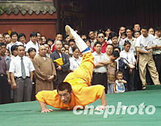 少林、武當(dāng)、峨眉三大武術(shù)門派精英賽二日下午在峨眉山下報國寺舉行,武術(shù)精英聚會峨眉山一展各門派絕技,為中外游人獻(xiàn)上一頓豐盛的“武”餐。圖為少林弟子李少輝向觀眾展示的蝎子拳。作者:魯彥
