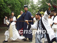 中國少林、武當(dāng)、峨眉三大門派的武林高手百余人在報國寺寺門外擺開擂臺,一展各派絕技。