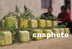 沂蒙山區(qū)費(fèi)縣大田鄉(xiāng)黃土莊村青年農(nóng)民田榮芳是當(dāng)?shù)剡h(yuǎn)近聞名的“沂蒙山西瓜王”,在十六大召開(kāi)前他經(jīng)過(guò)反復(fù)試驗(yàn),終于培育出了長(zhǎng)有“熱烈慶祝中國(guó)共產(chǎn)黨十六大勝利召開(kāi)”字樣的16個(gè)正方形西瓜,每個(gè)重約16斤左右。代表了沂蒙老區(qū)農(nóng)民心向黨中央的、盼望著黨的十六大早日召開(kāi)熱切心情。田榮芳高興地說(shuō):“俺正準(zhǔn)備把西瓜運(yùn)往北京,獻(xiàn)給黨中央、獻(xiàn)給十六大!”王樹(shù)芳、潘振宇 攝