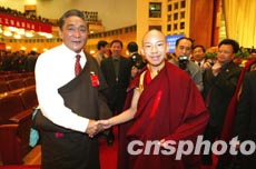 出席中國共產(chǎn)黨第十六次全國代表大會(huì)的熱地代表(左),八日在北京人民大會(huì)堂向特邀參加會(huì)議的十一世班禪額爾德尼.確吉杰布問候致意。作者:毛建軍