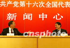 中國國家發(fā)展計劃委員會主任曾培炎(左)和國家經(jīng)貿(mào)委主任李榮融十日成為中共十六大新聞中心舉行的記者招待會新聞人物。作者:毛建軍