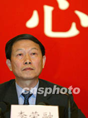 中國國家經(jīng)濟貿(mào)易委員會主任李榮融十日坐在中共十六大新聞中心臺上,回答中外記者的提問。作者:毛建軍