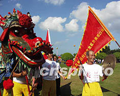 街道路邊椰樹(shù)上掛著紅燈籠和慶祝十六大閉幕的紅色標(biāo)語(yǔ)。下午二時(shí),海口最大的綠化公園早已人山人海,鼓號(hào)陣陣,海口人民懷著無(wú)比激動(dòng)的心情,在這片草地上載歌載舞,用舞龍、舞獅、秧歌、扇舞、竹竿舞、腰鼓、軍樂(lè)、太極拳等方式,表達(dá)他們喜悅的心情。