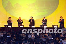 11月19日,第十六屆世界會(huì)計(jì)師大會(huì)在香港開幕,香港特首董建華(左二)、國際會(huì)計(jì)師聯(lián)合會(huì)會(huì)長雷尼·雷克爾(右二)等陪同中國國務(wù)院總理朱镕基出席。潘索菲 攝