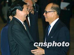 中國國務院總理朱镕基和夫人勞安,11月19日下午在香港會見中資機構的諸位“老板”,香港特首董建華和夫人陪同會見。中新社傳真任晨鳴攝