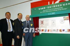 十二月六日,香港郵政發(fā)行紀(jì)念封,慶祝香港第一套郵票發(fā)行至今一百四十周年。左起為香港郵學(xué)會(huì)會(huì)長(zhǎng)關(guān)卓然、香港郵政署長(zhǎng)陸炳泉、香港郵學(xué)研究會(huì)(英國(guó))會(huì)長(zhǎng)卞耐特為巨型紀(jì)念封揭幕。中新社傳真 潘索菲 攝