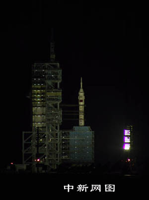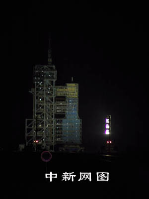 發(fā)射前半小時,“擁抱”著“神舟”四號飛船和“神箭”組合體的發(fā)射塔架旋轉(zhuǎn)平臺打開了一半。 中新社記者 孫自法 攝