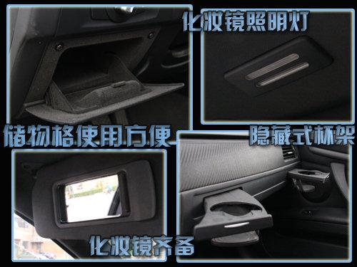 在燈光調(diào)節(jié)的下方設(shè)計(jì)有獨(dú)立的儲(chǔ)物空間;副駕駛位置在銀色提示條下隱藏著兩個(gè)水杯架;兩側(cè)的遮陽(yáng)板都設(shè)有化妝鏡,并配有獨(dú)立的照明燈;