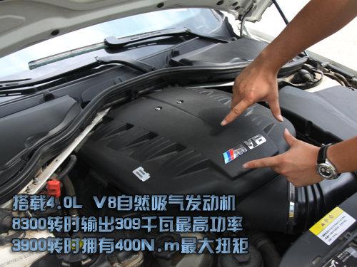 看完了外觀和內飾,M3透露出來的“偽”氣質似乎比較隱蔽,影影綽綽。現(xiàn)在咱們看看動力的部分。M3搭載4.0L V8自然吸氣發(fā)動機,應用Valvetronic (電子氣門技術)、DME數(shù)字式電子伺控系統(tǒng)、雙凸輪軸可變氣門正時控制系統(tǒng) (Bi-VANOS)等電子控制技術,8300轉時輸出309千瓦最高功率,3900轉時擁有400N.m最大扭矩。爆裂的孤狼性格此刻終于暴露了。