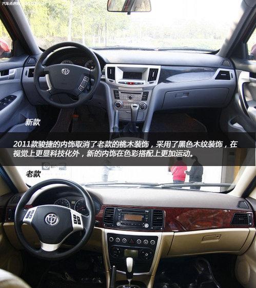 2011款駿捷的內(nèi)飾取消了老款的桃木裝飾,采用了黑色木紋裝飾,在視覺上更顯科技化外,新的內(nèi)飾在色彩搭配上更加運(yùn)動(dòng)。中控臺(tái)和老款車型差異很大,采用了大量的按鍵設(shè)計(jì),中控鎖、后備箱開關(guān)、油箱開關(guān)集成在最上面。新款駿捷的三幅方向盤改成了四幅式設(shè)計(jì),感覺更加穩(wěn)重。