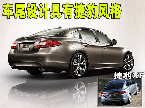 2011款英菲尼迪M在外觀設計上,吸取了在2009年日內瓦車展上展出的Essence概念車的設計元素。帶有上下拱形線條的長方形格柵,向后拉伸的L形大燈,發(fā)動機蓋兩邊巨幅隆起的動感褶皺以及優(yōu)美流暢的腰線。新款M的車尾方面,第一印象給了我們一種強烈的捷豹風格,收縮的臀部以及尾燈都讓我們想起了捷豹XK的動感車尾。