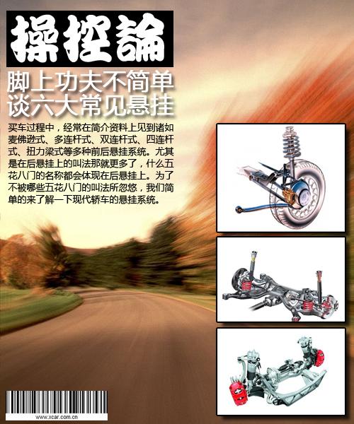 買車過程中,經(jīng)常在簡介資料上見到諸如麥佛遜式、多連桿式、雙連桿式、四連桿式、扭力梁式等多種前后懸掛系統(tǒng)。尤其是在后懸掛上的叫法那就更多了,什么五花八門的名稱都會體現(xiàn)在后懸掛上。為了不被哪些五花八門的叫法所忽悠,我們簡單的來了解一下現(xiàn)代轎車的懸掛系統(tǒng)。