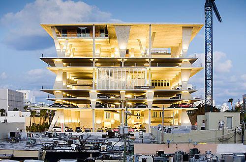作為行人長廊的補(bǔ)充,這座“雕塑車庫”在一個混凝土-玻璃結(jié)構(gòu)中結(jié)合了300個車位的車庫,零售商店和一個頂層海景餐廳。車庫的每一層都利用了自然光線,而且能夠一覽邁阿密優(yōu)美的天際線。