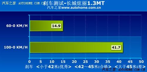 長城汽車的剎車一直得到較高的評(píng)價(jià),我們對1.3L車型進(jìn)行的剎車測試中,車輛全力剎車,車速從100-0KM/h的最短制動(dòng)距離為41.7米,系統(tǒng)的穩(wěn)定性處于中等水平,剎車成績還是不錯(cuò)的,我們比較滿意。