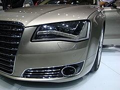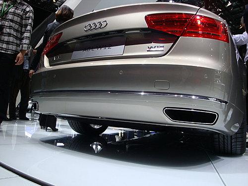 全新奧迪A8L W12 quattro在車身外觀上還有一系列的改進(jìn),包括單幅式水箱進(jìn)氣格柵,其中間為鉻金屬噴涂的橫條裝飾。在其空氣通風(fēng)口以及側(cè)后視鏡邊緣還擁有鉻金屬的嵌入物裝飾。其進(jìn)氣格柵處及車尾還配有W12的標(biāo)志,以顯示該車身份的不同。梯形的雙尾氣排放管與后保險(xiǎn)杠完美的結(jié)合在一起。