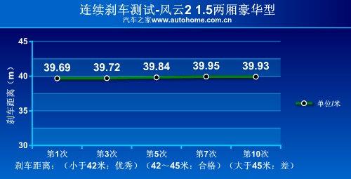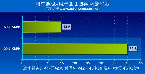我們對風云21.5L兩廂豪華型進行的性能測試中顯示,從100KM/h全力制動到車輛靜止,剎車距離為39.8米,成績非常出色;剎車踏板回饋力較大,所以在剎車時需要使用更大力氣,在日常駕駛中踏板的余量偏大,不過一旦深踩,制動效果明顯。