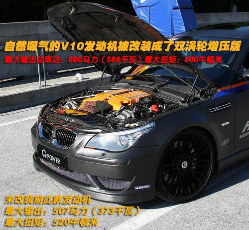 G – Power打造的這款M5是以老款的M5為基礎(chǔ),在本已經(jīng)非常強(qiáng)大的V10發(fā)動(dòng)機(jī)倉中加裝了兩個(gè)渦輪增壓器,通過一系列的電腦以及油路等相關(guān)調(diào)校,讓老款的M5的動(dòng)力性甚至超過了V12發(fā)動(dòng)機(jī)。超過370km/h的最高時(shí)速比拼F1賽車。