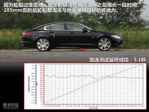 當(dāng)進(jìn)行加速測試時(shí),按慣例我們會(huì)阻止所有電子系統(tǒng)介入,將轉(zhuǎn)速維持在發(fā)動(dòng)機(jī)最佳發(fā)力區(qū),在起步的瞬間使輪胎處于滑與不滑的臨界點(diǎn),之后全力沖刺。不過很抱歉,經(jīng)過多次嘗試,我們無法令XFR獲得最佳的起跑狀態(tài),原因就是因?yàn)檩喬ミ^度磨損,起步的轉(zhuǎn)速一再下降,而順利起步之后很長一段時(shí)間,285mm寬的后輪胎都無法與地面保持良好的抓地力。通過加速曲線圖也可以看出,起步后接近1秒的時(shí)間,加速度都不高,有時(shí)還處于下降狀態(tài),最終5.1秒的加速成績并不是XFR的最強(qiáng)能力。