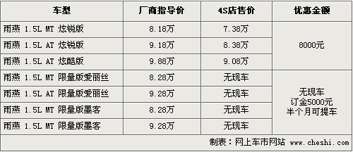 長安鈴木雨燕是小型車型中最受歡迎的一款之一,在推出限量版車型后,雨燕從整車的外觀和內(nèi)飾的風(fēng)格上更具個性化,時尚化,滿足了都市年輕80后的喜愛。根據(jù)網(wǎng)上車市價格監(jiān)測系統(tǒng)顯示,目前雨燕全系最高能優(yōu)惠現(xiàn)金8000元,限量版車型則需要預(yù)訂,具體車型以及價格如下: