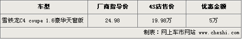 據(jù)4S店銷售人員介紹,目前銷售的C4轎跑車只有頂配1.6豪華天窗版,店內(nèi)有銀色和紅色現(xiàn)車供應(yīng),數(shù)量有限。頂配版原來廠商指導(dǎo)價(jià)格為24.98萬元,現(xiàn)在售價(jià)僅為19.98萬,直降5萬元現(xiàn)金,車價(jià)不足20萬元。