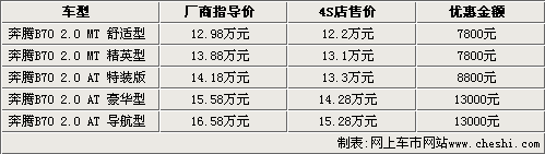 據(jù)一汽奔騰汽車4S店銷售人員介紹,目前09款奔騰B70現(xiàn)車顏色不全,主要以銀色車型為主,目前手動擋車型只能優(yōu)惠7800元;上市不久的自動特裝版能夠優(yōu)惠8800元;而另外兩款自動擋車型現(xiàn)在能夠優(yōu)惠13000元,如果到店還能有更多的優(yōu)惠政策。2010款奔騰將于九月中下旬推出,目前能夠接受預(yù)訂,訂金為5000元。