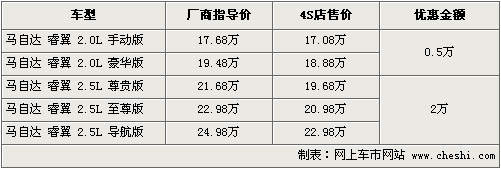 睿翼是一汽馬自達(dá)旗下的主力車型,憑借著運動性的流線型外觀和精準(zhǔn)的操控性贏得了消費者的青睞。隨著2.0排量車型在10月22日正式上市銷售,目前一汽馬自達(dá)睿翼已推出五款車型分別覆蓋了2.0和2.5排量。據(jù)網(wǎng)上車市價格監(jiān)測系統(tǒng)顯示:目前這款車的最高優(yōu)惠持續(xù)在現(xiàn)金2萬元。具體車型行情如下: