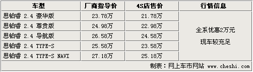 東風本田旗下的首款運動中高級車型——思鉑睿于09年9月初上市,全系共計五款車型,售價為23.78萬元—27.18萬元。上根據(jù)網(wǎng)上車市價格監(jiān)測系統(tǒng)顯示,目前購買思鉑睿全系可優(yōu)惠現(xiàn)金2萬元,現(xiàn)車方面較為齊全。具體車型行情如下: