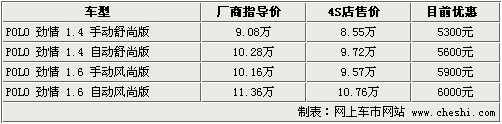 據(jù)4S店銷售人員介紹:目前POLO勁情全系僅為4款車型。之前的1.4升手動擋兩款車型合并為1.4手動舒尚版,1.4升自動擋兩款車同樣合為1.4自動舒尚版。其余1.6升兩款車型不變。目前全系最高優(yōu)惠6000元,其余三款車優(yōu)惠幅度都有所不同。目前全系現(xiàn)車比較少,個別車型僅有1-2臺現(xiàn)車。但目前有在途中車輛,最短等待1周,最長等待2周時間。我們建議購買銀色、藍色、紅色車款,這3種顏色車型預定時間短,且店內(nèi)個別車型有此顏色現(xiàn)車。