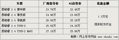 東風(fēng)本田思鉑在09年9月初上市,全系共計(jì)五款車(chē)型,售價(jià)為23.78萬(wàn)元—27.18萬(wàn)元。上市后一直備受關(guān)注,訂單和銷(xiāo)量也持續(xù)增加。根據(jù)網(wǎng)上車(chē)市價(jià)格監(jiān)測(cè)系統(tǒng)顯示,目前購(gòu)買(mǎi)思鉑睿全系可優(yōu)惠現(xiàn)金1.3萬(wàn)元,現(xiàn)車(chē)方面較為齊全。具體車(chē)型行情如下: