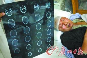 昨天晚上,記者趕到了救治黃國順的中山三院。當時,護士正在為他換藥包扎傷口,黃國順指了指床下的染紅藥布,告訴記者這是他妻子剛剛為他擦掉的血跡。