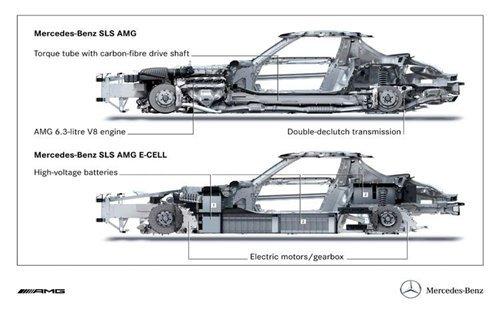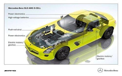 由于前軸的電動機占用了一定的空間,SLS E-Cell的前懸將從SLS的雙叉臂變?yōu)槎噙B桿結(jié)構(gòu)。新車的鋰電池組位于車輛中部和后部,擁有480千瓦的功率。電池的冷卻則有專門的兩個循環(huán)系統(tǒng)完成。