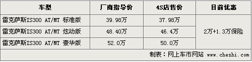 據(jù)4S店銷售人員介紹,目前雷克薩斯IS300各款現(xiàn)車數(shù)量并不多,標(biāo)準(zhǔn)版和炫動(dòng)版有銀色、白色、黑色等款可供選擇。在價(jià)格優(yōu)惠方面,現(xiàn)在購(gòu)車可優(yōu)惠現(xiàn)金2萬,同時(shí)贈(zèng)送價(jià)值1.3萬元的保險(xiǎn)。銷售人員還介紹,購(gòu)買IS300時(shí),根據(jù)車身顏色不同其價(jià)格還將有一定幅度的變化。