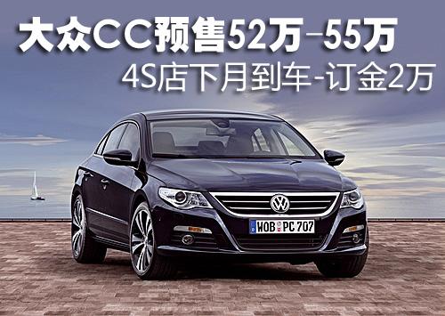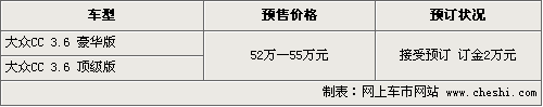 大眾CC自去年廣州車(chē)展亮相后一直受到消費(fèi)者廣泛關(guān)注,此前有關(guān)這款車(chē)的詳細(xì)參數(shù)和配置已經(jīng)曝光。大眾CC將搭載3.6FSI燃油直噴引擎和6速DSG雙離合變速箱,將分豪華版和頂級(jí)版兩款。根據(jù)網(wǎng)上車(chē)市價(jià)格監(jiān)測(cè)系統(tǒng)顯示,目前這款車(chē)有望在下月到店,4S店開(kāi)始接受消費(fèi)者預(yù)訂,具體行情如下: