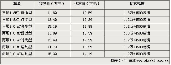 經(jīng)銷商表示,購(gòu)買?怂谷弟囆统丝梢缘玫1.3萬(wàn)元的現(xiàn)金優(yōu)惠外,還可以得到價(jià)值4500元汽車裝飾。優(yōu)惠后的福克斯兩廂1.8MT 舒適型售價(jià)僅為10.59萬(wàn)。銷售人員還表示,目前?怂勾蟛糠周囆偷挠鞋F(xiàn)車,顏色方面可選余地不大。