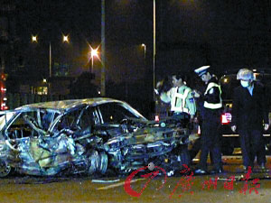 事發(fā)凌晨零時10分,相撞的兩輛私家車的其中一輛內(nèi)有3人,車右側(cè)被撞得粉碎,碎片散落一地,右邊的前輪完全凹進去,前車玻璃也被撞破。所幸司機只受了輕傷,隨后被120接走。而另一輛車則被撞得嚴重變形,起火燃燒,只剩下鐵架。從外面看,已經(jīng)看不到里面有人。但清障車的工作人則說“里面的那個人燒成炭了”。凌晨1時30分左右,殯儀館車來到現(xiàn)場。由于車嚴重變形,車門打不開,運政人員只好用鐵鍬把門撬開。(練情情)