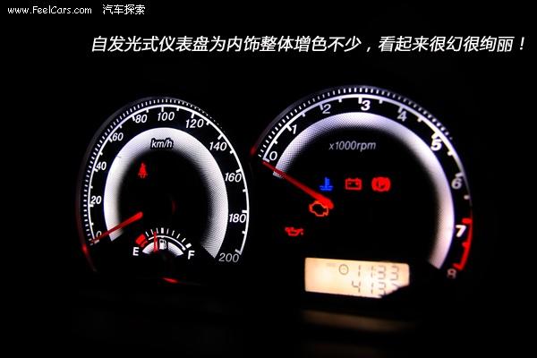 比較夢幻的是絢麗的儀表。黑色的表底下白色泛出的刻度以及紅色的指針很是顯眼。面積雖然不大,但為整個內(nèi)飾都呈現(xiàn)出一種比較有檔次的效果。上面的擋板保證了其自發(fā)光的設定時刻都不會因為陽光的原因而影響讀取信息,當然如果面積更大一些的話,那感覺就會更好一些。