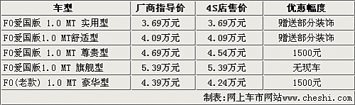 據(jù)比亞迪汽車4S店銷售人員介紹,現(xiàn)在比亞迪F0愛國版igo系列車型的現(xiàn)車比較齊全,只有旗艦型沒有現(xiàn)車,但消費者可以預訂。售價3.99萬元的老款舒適型現(xiàn)在已經(jīng)停產(chǎn),而老款豪華型目前還有部分現(xiàn)車銷售。另外,比亞迪FO老款豪華型和尊貴型目前都可以優(yōu)惠現(xiàn)金1500元,實用型和新舒適型只可以贈送部分裝飾。
