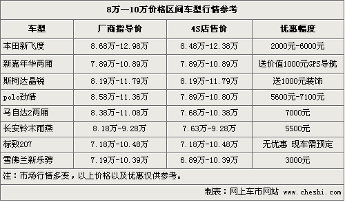 三、8萬—10萬之間匯集了眾多明星級車型,也是眾多合資品牌競爭最為激烈的陣地。新上市的新嘉年華兩廂、斯柯達(dá)晶銳、標(biāo)致207都是最好的證明。這個區(qū)間車型外觀亮眼個性,內(nèi)飾空間和操控性各方面表現(xiàn)各異。新飛度、雨燕省油好看,馬自達(dá)2、勁情操控不錯,嘉年華和晶銳期待在市場上有更好的表現(xiàn),每款車各有所長,跑在大街上絕對是一道靚麗的風(fēng)景。