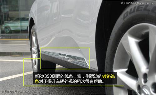 新RX350的側(cè)面線條要較舊款豐富許多,各種裝飾配件也更加耀眼。特別是側(cè)面裙底的鍍鉻飾條,對(duì)于提升車輛外觀的檔次很有幫助。